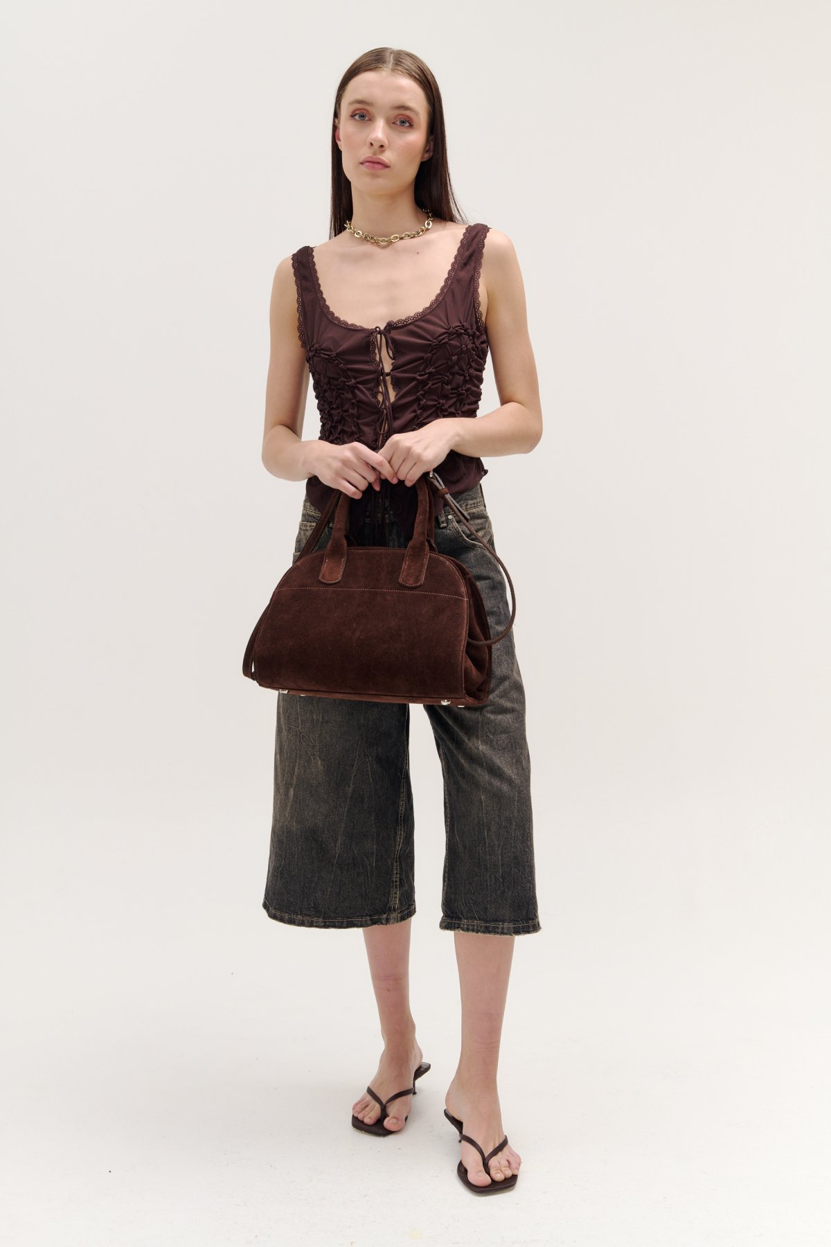 Su boca principal cierra con broche imán. Cuenta con manija corta y correa larga regulable y desmontable.Su interior está forrado y cuenta con dos bolsillos, uno de ellos posee cierre.