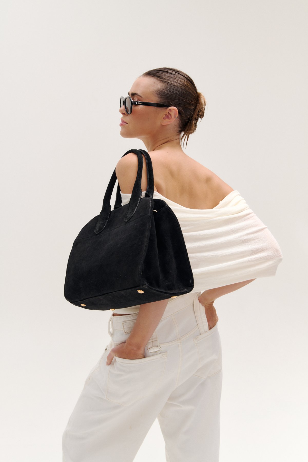 Cartera semirrígida confeccionada en cuero vacuno. Posee 4 tacos metálicos en su base.